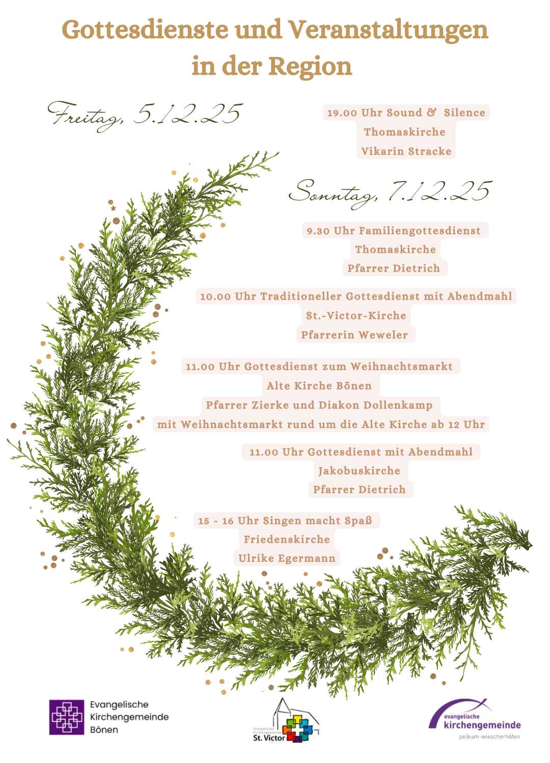 Die Kirchengemeinden Bönen, Herringen und Pelkum-Wiescherhöfen arbeiten in der Region eng zusammen. Daher veröffentlichen wir an dieser Stelle neben den Gottesdiensten der Bönener Kirchengemeinde auch die gottesdienstlichen Angebote der beiden anderen Kirchengemeinden.