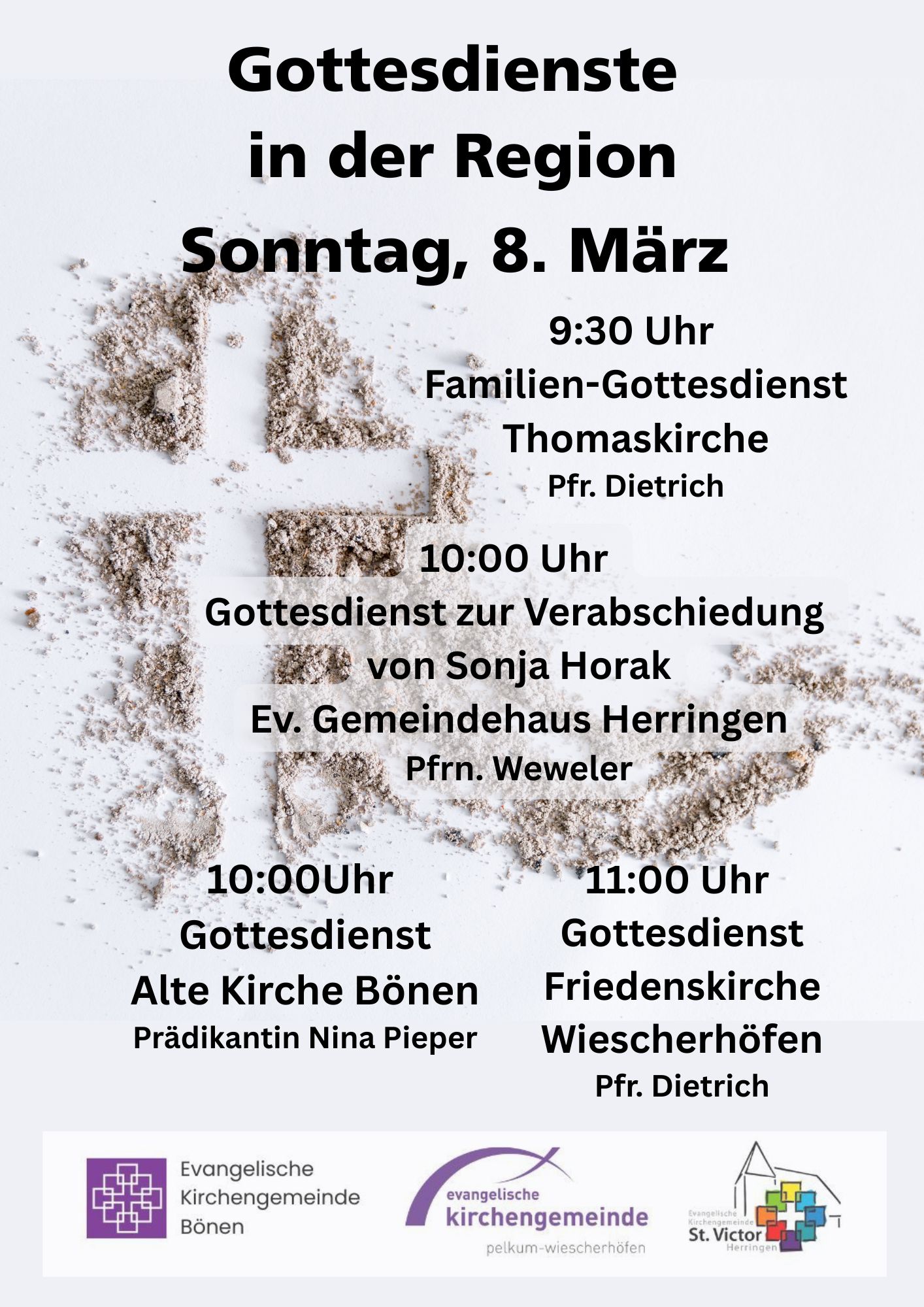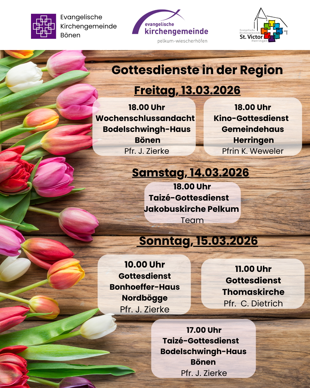 Die Kirchengemeinden Bönen, Herringen und Pelkum-Wiescherhöfen arbeiten in der Region eng zusammen. Daher veröffentlichen wir an dieser Stelle neben den Gottesdiensten der Bönener Kirchengemeinde auch die gottesdienstlichen Angebote der beiden anderen Kirchengemeinden.